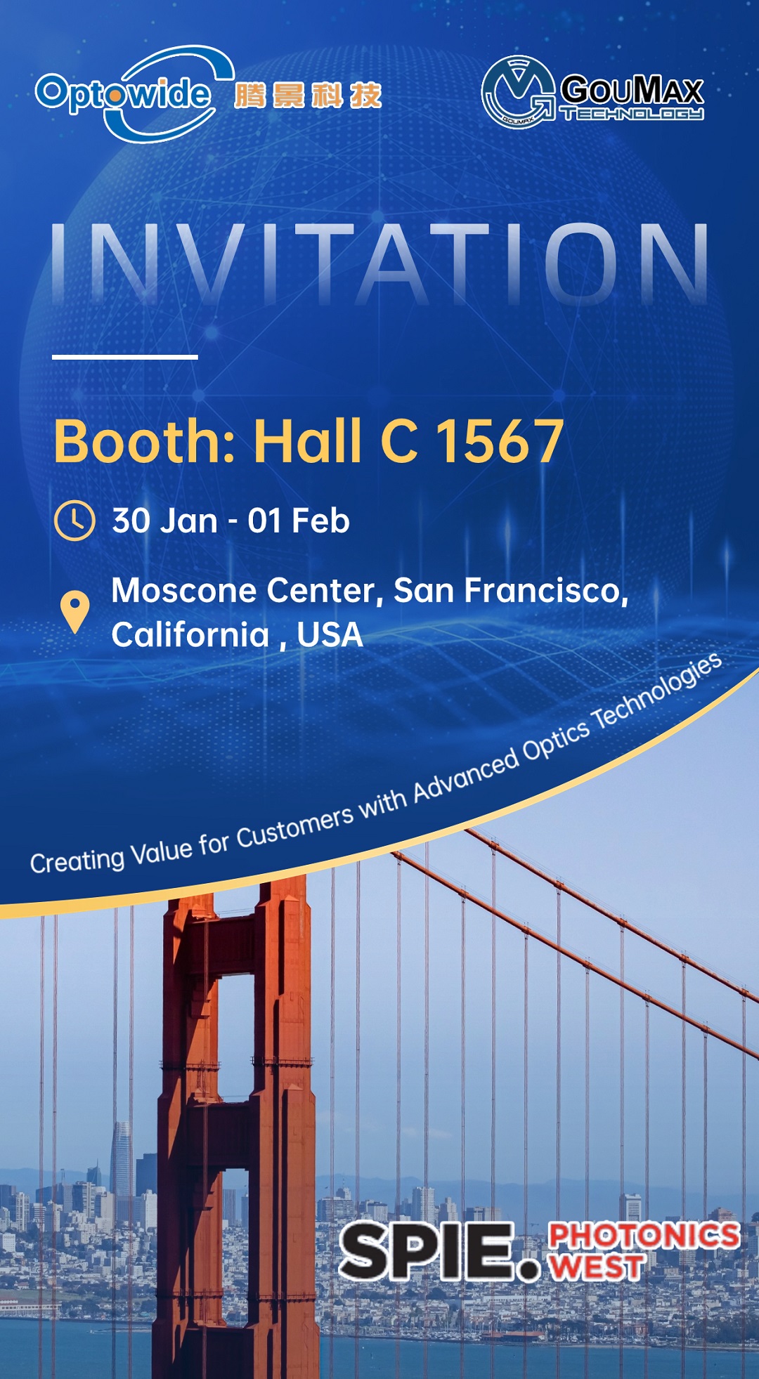 凤凰联盟官方网站将参加1月30日-2月1日在美国旧金山举办的2024年SPIE西部光电展。凤凰联盟官方网站展位号Hall C 1567,将展出光通信、光纤激光、生物医疗、AR、车载等应用领域的各类产品,欢迎各位现场参观交流。