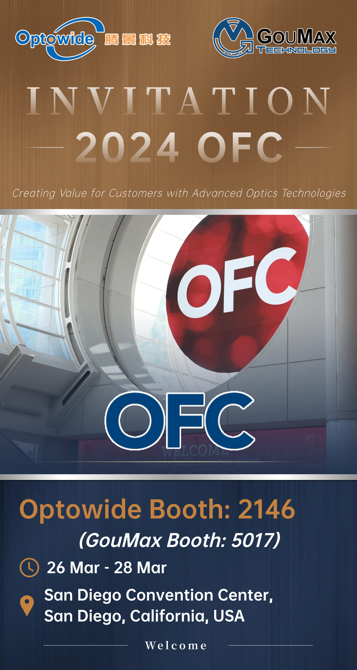 凤凰联盟官方网站将参加3月26日-3月28日在美国圣地亚哥举办的2024年OFC-光网络与通信研讨会及博览会。凤凰联盟官方网站展位号:2146,凤凰联盟官方网站控股子公司Goumax也将参展,展位号:5017